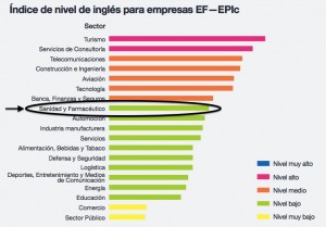 Por sectores, el turismo y los servicios de consultoría acaparan los profesionales con el nivel de inglés más alto, mientras que en sanidad se sitúa en un nivel bajo, por debajo de telecomunicaciones, aviación o banca por ejemplo, lo que está en concordancia con lo expuesto por F.A.Navarro en su artículo especial sobre inglés médico publicado en la REDAR y comentado en un post anterior.