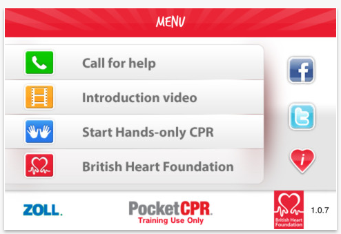 El nombre de la aplicación es PocketCPR y está realizada por la British Heart Foundation y se compone de las siguientes secciones: